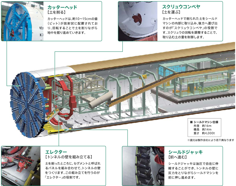 マシン前方のカッターヘッドでトンネルを掘り進めると同時に、エレクターと呼ばれる部分で、トンネルの壁を組み立てていきます。また、掘り進める際に発生した土は、マシンの内部に取り込み、さらに後方へと運びます。