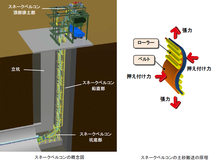 「スネークベルコン」は、2枚のベルトの間に土砂を挟みこみ、ローラーで押さえつけながら地上へ土砂を運びます。