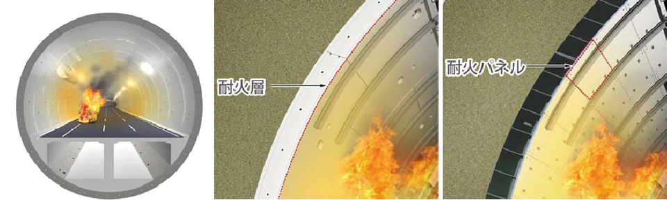 万が一トンネル内で火災が発生した場合、トンネルの壁であるセグメントが熱により損傷するとトンネルが崩壊する可能性があります。そのため、セグメントに耐火性能をもたせることで、火災時の熱にも 強いトンネルとしています。
