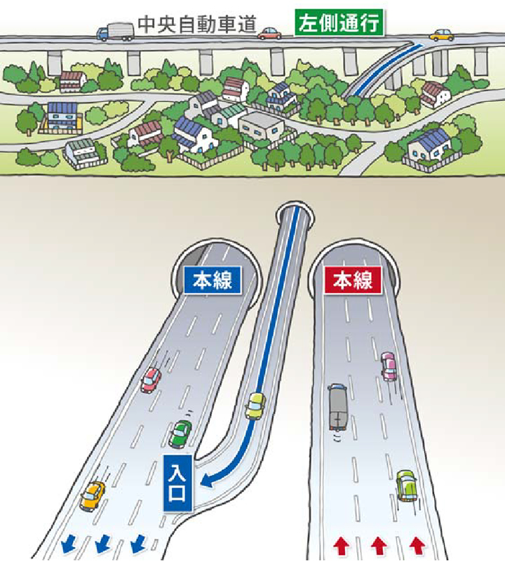 前の車を追い越す際に使う、一番右側の追越車線から合流する必要がないため、安心してトンネルに合流できます。